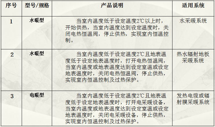 用途:主要用于電采暖系統特有的雙溫雙控功能,在檢測室溫的同時又增加了對采暖設備的溫度監測,溫度監測范圍20~90℃,當設備溫度達到設定值時,溫控器自動停止加熱,保護電加熱設備,使采暖設備能夠在合理的溫度下工作,延長設備的使用壽命,使系統更加安全、可靠、節能。